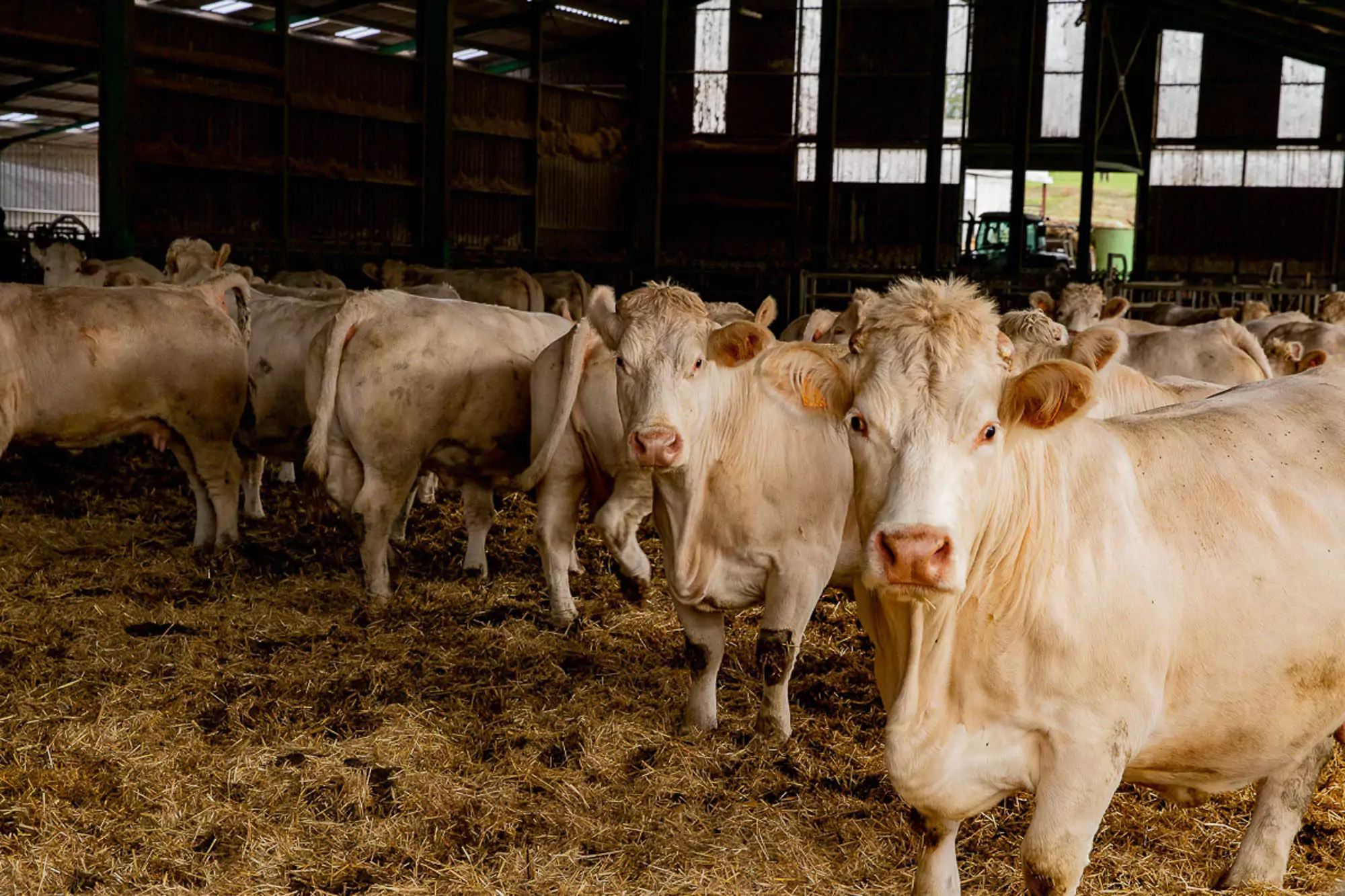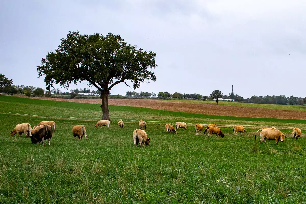 Il y a 10 ans, Christophe décide de se diversifier. En plus des charolaises originaires de la région, il décide d'élever des vaches d’Aubrac. Plus rustiques, elles mangent moins que leurs consoeurs du Charolais : là ou vous pouvez nourrir 2 charolaises, les rations sont suffisantes pour 3 aubracs. De plus, le vêlage est facile et elles bénéficient d’excellentes facultés maternelles. Selon Christophe, leur viande est meilleure et bien rouge, au grain fin et au goût subtil et délicieux.