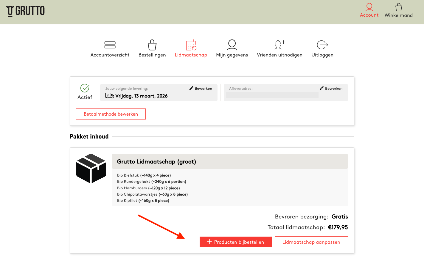 Wil je het bezorgmoment of jouw bezorggegevens op een later moment veranderen? Dat is makkelijk! Je kunt wijzigingen in de bezorging doorgeven door in te loggen in Mijn Account bovenaan op de website. Daar kun je met een klik op de knop een ander bezorgmoment kiezen en jouw gegevens wijzigen. Dit kan tot de donderdagmiddag 16.00 uur voor de bezorging. Is dat al geweest? Stuur dan even een berichtje naar vragen@grutto.com en we zorgen dat je alsnog je pakket ontvangt!